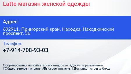 Latte, магазин женской одежды по адресу 692911, Приморский край, Находка, Находкинский проспект, 36 в дальнейшем Организация, размещена в следующих категориях: