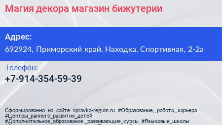 Магия декора, магазин бижутерии по адресу 692924, Приморский край, Находка, Спортивная, 2-2а в дальнейшем Организация, размещена в следующих категориях: