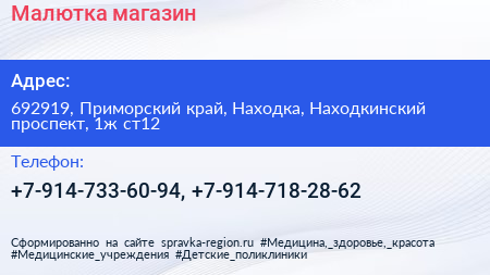 Малютка, магазин по адресу 692919, Приморский край, Находка, Находкинский проспект, 1ж ст12 в дальнейшем Организация, размещена в следующих категориях: