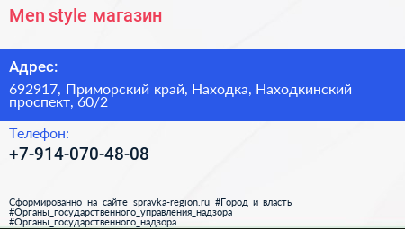 Men style, магазин по адресу 692917, Приморский край, Находка, Находкинский проспект, 60/2 в дальнейшем Организация, размещена в следующих категориях: