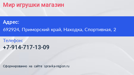 Мир игрушки, магазин по адресу 692924, Приморский край, Находка, Спортивная, 2 в дальнейшем Организация, размещена в следующих категориях: