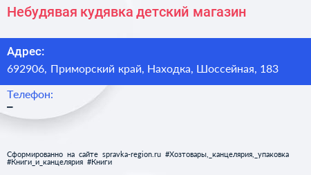 Небудявая кудявка, детский магазин по адресу 692906, Приморский край, Находка, Шоссейная, 183 в дальнейшем Организация, размещена в следующих категориях: