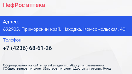 НефРос, аптека по адресу 692905, Приморский край, Находка, Комсомольская, 40 в дальнейшем Организация, размещена в следующих категориях: