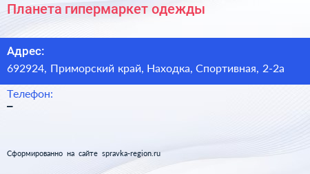 Планета, гипермаркет одежды по адресу 692924, Приморский край, Находка, Спортивная, 2-2а в дальнейшем Организация, размещена в следующих категориях: