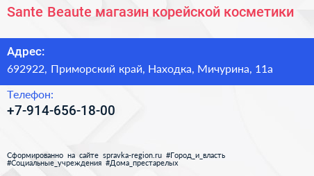 Sante & Beaute, магазин корейской косметики по адресу 692922, Приморский край, Находка, Мичурина, 11а в дальнейшем Организация, размещена в следующих категориях: