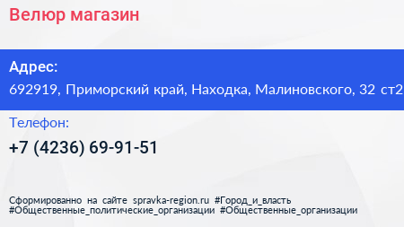 Велюр, магазин по адресу 692919, Приморский край, Находка, Малиновского, 32 ст2 в дальнейшем Организация, размещена в следующих категориях: