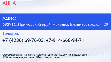 АННА по адресу 692911, Приморский край, Находка, Владивостокская, 29 в дальнейшем Организация, размещена в следующих категориях: