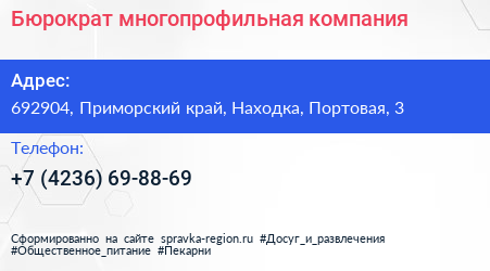 Бюрократ, многопрофильная компания по адресу 692904, Приморский край, Находка, Портовая, 3 в дальнейшем Организация, размещена в следующих категориях: