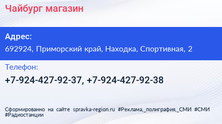 Чайбург, магазин по адресу 692924, Приморский край, Находка, Спортивная, 2 в дальнейшем Организация, размещена в следующих категориях: