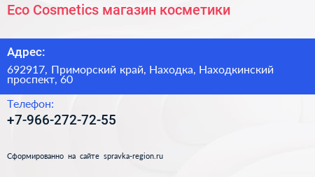 Eco Cosmetics, магазин косметики по адресу 692917, Приморский край, Находка, Находкинский проспект, 60 в дальнейшем Организация, размещена в следующих категориях: