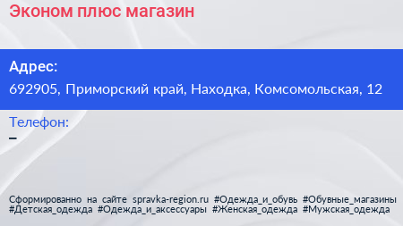 Эконом плюс, магазин по адресу 692905, Приморский край, Находка, Комсомольская, 12 в дальнейшем Организация, размещена в следующих категориях: