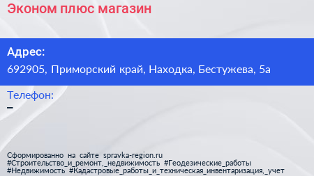 Эконом плюс, магазин по адресу 692905, Приморский край, Находка, Бестужева, 5а в дальнейшем Организация, размещена в следующих категориях: