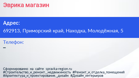 Эврика, магазин по адресу 692913, Приморский край, Находка, Молодёжная, 5 в дальнейшем Организация, размещена в следующих категориях: