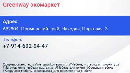 Greenway, экомаркет по адресу 692904, Приморский край, Находка, Портовая, 3 в дальнейшем Организация, размещена в следующих категориях: