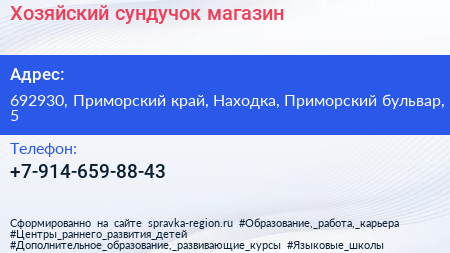 Хозяйский сундучок, магазин по адресу 692930, Приморский край, Находка, Приморский бульвар, 5 в дальнейшем Организация, размещена в следующих категориях: