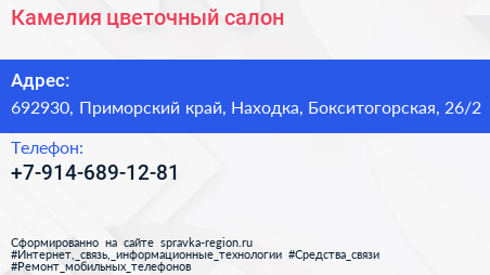 Камелия, цветочный салон по адресу 692930, Приморский край, Находка, Бокситогорская, 26/2 в дальнейшем Организация, размещена в следующих категориях: