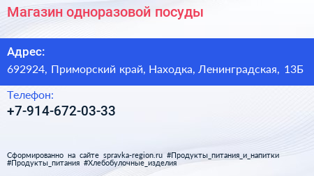 Магазин одноразовой посуды по адресу 692924, Приморский край, Находка, Ленинградская, 13Б в дальнейшем Организация, размещена в следующих категориях: