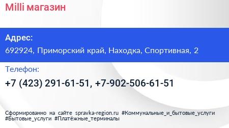 Milli, магазин по адресу 692924, Приморский край, Находка, Спортивная, 2 в дальнейшем Организация, размещена в следующих категориях: