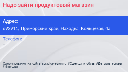 Надо зайти, продуктовый магазин по адресу 692911, Приморский край, Находка, Кольцевая, 4а в дальнейшем Организация, размещена в следующих категориях: