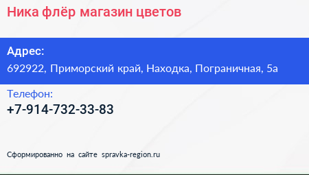 Ника флёр, магазин цветов по адресу 692922, Приморский край, Находка, Пограничная, 5а в дальнейшем Организация, размещена в следующих категориях: