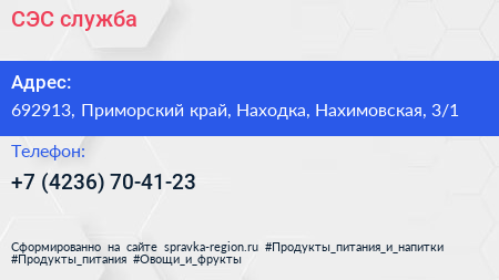 СЭС, служба по адресу 692913, Приморский край, Находка, Нахимовская, 3/1 в дальнейшем Организация, размещена в следующих категориях: