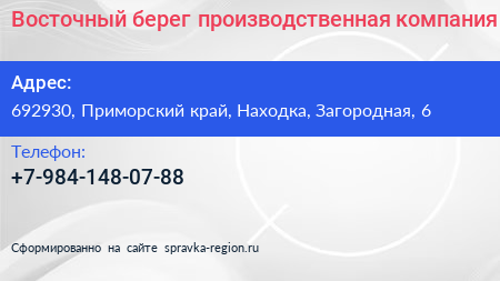 Восточный берег, производственная компания по адресу 692930, Приморский край, Находка, Загородная, 6 в дальнейшем Организация, размещена в следующих категориях: