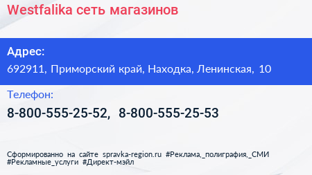 Westfalika, сеть магазинов по адресу 692911, Приморский край, Находка, Ленинская, 10 в дальнейшем Организация, размещена в следующих категориях: