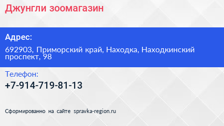 Джунгли, зоомагазин по адресу 692903, Приморский край, Находка, Находкинский проспект, 98 в дальнейшем Организация, размещена в следующих категориях: