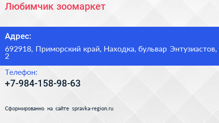 Любимчик, зоомаркет по адресу 692918, Приморский край, Находка, бульвар Энтузиастов, 2 в дальнейшем Организация, размещена в следующих категориях:
