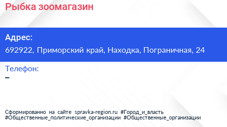 Рыбка, зоомагазин по адресу 692922, Приморский край, Находка, Пограничная, 24 в дальнейшем Организация, размещена в следующих категориях: