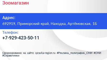 Зоомагазин по адресу 692919, Приморский край, Находка, Артёмовская, 1Б в дальнейшем Организация, размещена в следующих категориях: