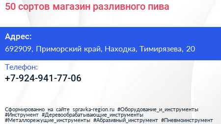 50 сортов, магазин разливного пива по адресу 692909, Приморский край, Находка, Тимирязева, 20 в дальнейшем Организация, размещена в следующих категориях: