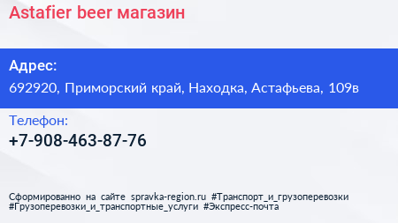 Astafier beer, магазин по адресу 692920, Приморский край, Находка, Астафьева, 109в в дальнейшем Организация, размещена в следующих категориях: