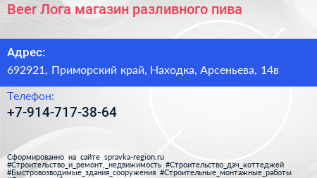 Beer Лога, магазин разливного пива по адресу 692921, Приморский край, Находка, Арсеньева, 14в в дальнейшем Организация, размещена в следующих категориях: