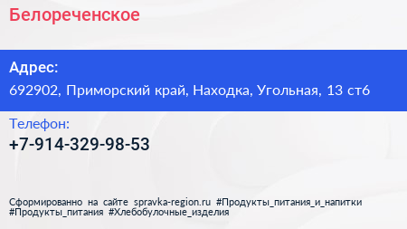 Белореченское по адресу 692902, Приморский край, Находка, Угольная, 13 ст6 в дальнейшем Организация, размещена в следующих категориях: