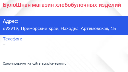 БулоШная, магазин хлебобулочных изделий по адресу 692919, Приморский край, Находка, Артёмовская, 1Б в дальнейшем Организация, размещена в следующих категориях:
