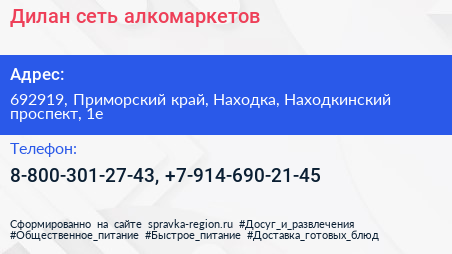 Дилан, сеть алкомаркетов по адресу 692919, Приморский край, Находка, Находкинский проспект, 1е в дальнейшем Организация, размещена в следующих категориях: