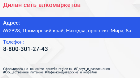 Дилан, сеть алкомаркетов по адресу 692928, Приморский край, Находка, проспект Мира, 8а в дальнейшем Организация, размещена в следующих категориях: