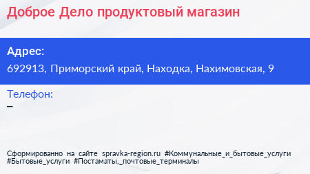 Доброе Дело, продуктовый магазин по адресу 692913, Приморский край, Находка, Нахимовская, 9 в дальнейшем Организация, размещена в следующих категориях: