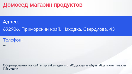 Домосед, магазин продуктов по адресу 692906, Приморский край, Находка, Свердлова, 43 в дальнейшем Организация, размещена в следующих категориях: