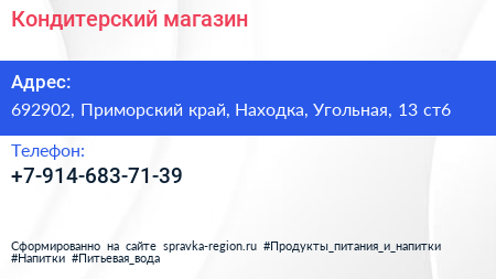 Кондитерский магазин по адресу 692902, Приморский край, Находка, Угольная, 13 ст6 в дальнейшем Организация, размещена в следующих категориях: