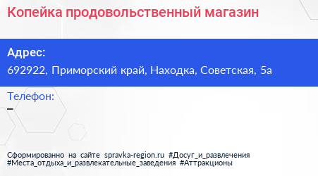 Копейка, продовольственный магазин по адресу 692922, Приморский край, Находка, Советская, 5а в дальнейшем Организация, размещена в следующих категориях: