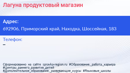 Лагуна, продуктовый магазин по адресу 692906, Приморский край, Находка, Шоссейная, 183 в дальнейшем Организация, размещена в следующих категориях: