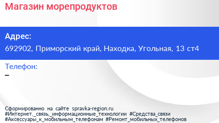 Магазин морепродуктов по адресу 692902, Приморский край, Находка, Угольная, 13 ст4 в дальнейшем Организация, размещена в следующих категориях: