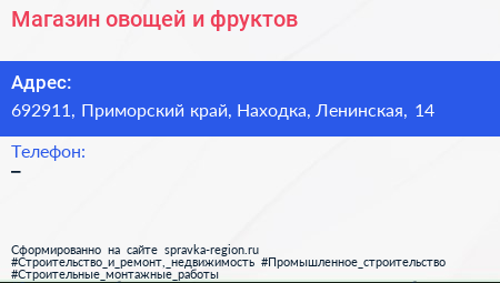 Магазин овощей и фруктов по адресу 692911, Приморский край, Находка, Ленинская, 14 в дальнейшем Организация, размещена в следующих категориях: