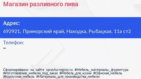 Магазин разливного пива по адресу 692921, Приморский край, Находка, Рыбацкая, 11а ст2 в дальнейшем Организация, размещена в следующих категориях: