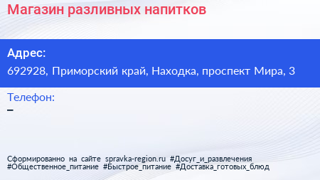 Магазин разливных напитков по адресу 692928, Приморский край, Находка, проспект Мира, 3 в дальнейшем Организация, размещена в следующих категориях: