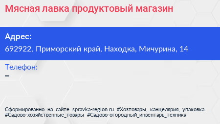 Мясная лавка, продуктовый магазин по адресу 692922, Приморский край, Находка, Мичурина, 14 в дальнейшем Организация, размещена в следующих категориях: