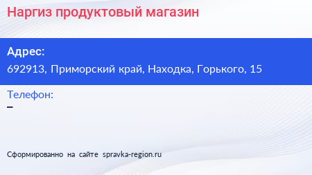 Наргиз, продуктовый магазин по адресу 692913, Приморский край, Находка, Горького, 15 в дальнейшем Организация, размещена в следующих категориях: