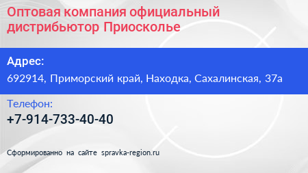 Оптовая компания, официальный дистрибьютор Приосколье по адресу 692914, Приморский край, Находка, Сахалинская, 37а в дальнейшем Организация, размещена в следующих категориях: